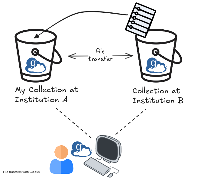 A collection is a named location containing data that can be accessed with Globus. Think of it as a shared folder, or a file bucket. The underlying storage device hosting the collection could be anything from an HPC cluster, or even a laptop.