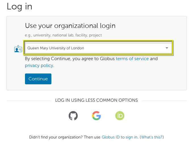 Enter the organisation name, QMUL users should enter the name as shown below.