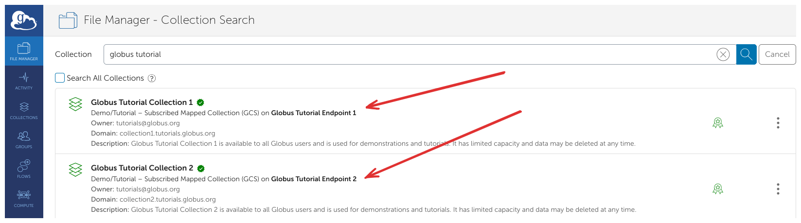 Globus will list collections with matching names. The collections Globus Tutorial Collection 1 and Globus Tutorial Collection 2 are administered by the Globus team for demonstration purposes and are accessible to all Globus users without further authentication, giving you the opportunity to follow along with this lesson.