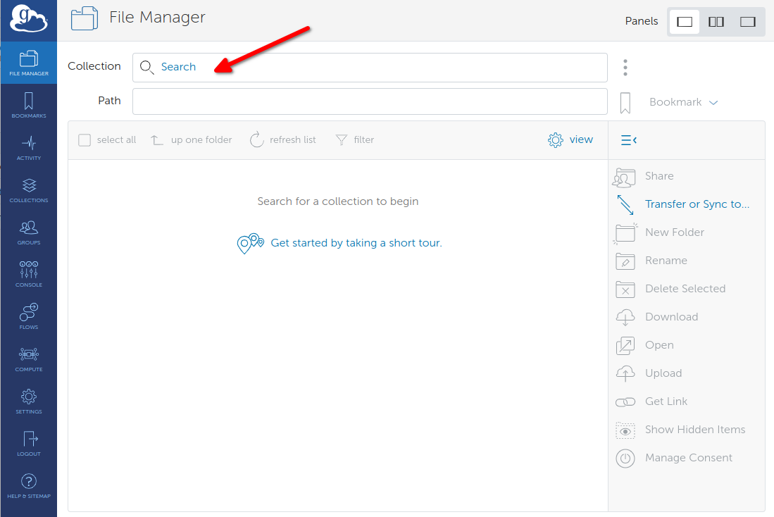 Globus will connect to the collection and display the default directory (it will be empty).