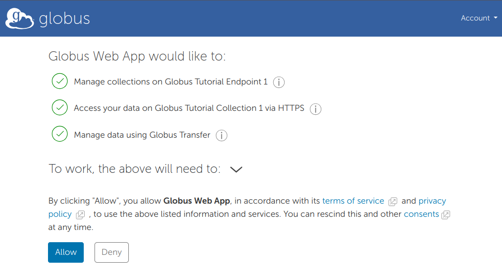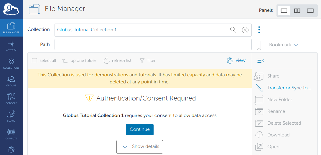 Click on Globus Tutorial Collection 1. If this is the first time accessing the collection, you will get an additional consent page. Clicking "Continue" will allow Globus to access that data with your account.