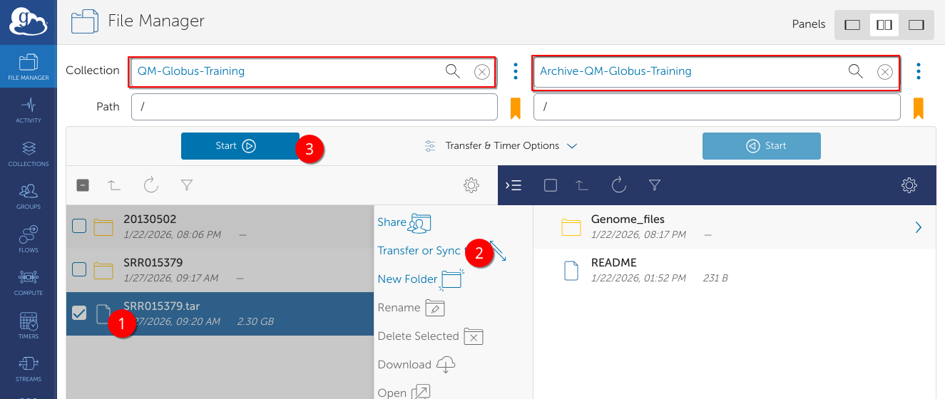 We visit app.globus.org and access the 2 collections QM-Globus-Training (where the source data resides) and Archive-QM-Globus-Training (the destination we wish to deposit data into). We select the newly created tar file, click Transfer and Sync, ensure we have navigated to the desired folder and click Start.